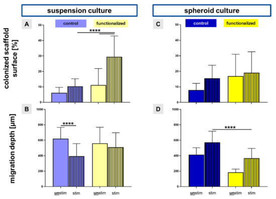 The statistic evaluation of the colonized scaffold surface and the migration depth into the scaffolds seeded with the suspension and the spheroid culture. Based on the vitality assay, the colonized scaffold surface ((A) suspension and (C) spheroid pre-culture) was evaluated. The migration depth of the cells into inner parts of the scaffolds ((B) suspension and (D) spheroid pre-culture) was measured after a DAPI staining of longitudinal sections. Control (non-functionalized, blue bars) and functionalized (yellow bars) scaffolds, seeded with two different colonization strategies (suspension: dynamically pre-cultured for 24 h and spheroid: statically pre-cultured for 5 days) were compared as well as unstimulated (unstim: full bars) against stimulated (72 h, 4% stretch, 0.11 Hz, stim: striped bars). One-way ANOVA test with Tukey post hoc test showed significant differences (****) with p ≤ 0.0001. Three independent experiments with cells of three different donors were performed.