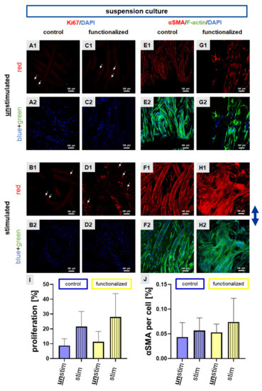 Ki67 and αSMA protein expression in scaffolds seeded with the suspension culture. Suspension pre-culture was performed for 24 h dynamically. Immunocytochemical staining of Ki67 (red) was performed for control (A,B) and functionalized scaffolds (C,D). Immunocytochemical staining of the myofibroblast marker α-smooth muscle actin (αSMA, red) combined with F-actin staining (green) was performed for control (E,F) and functionalized scaffolds (G,H). Unstimulated (A,C,E,G) scaffolds were compared with stimulated (72 h, 4% stretch, 0.11 Hz, (B,D,F,H)). The proliferation rate (I) and αSMA immunoreactivity per cell (%) (J) were calculated. Cell nuclei were counterstained using 4′,6′-diamidino-2-phenylindol (DAPI, blue). The blue arrow on the right side indicates the stretch direction. For the overlay of immunocytochemical staining please refer to Supplementary Figure S1. Scale bars: 100 µm. Three independent experiments with cells of three different donors were performed. Unstim = unstimulated, stim = stimulated. Mean values with SD were shown in the statistical evaluation. One-way ANOVA testing did not show significant differences.