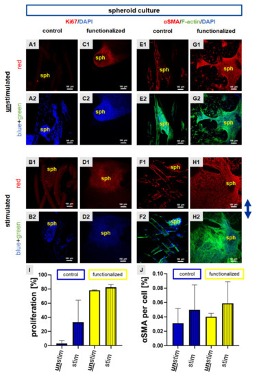 Ki67 and αSMA protein expression in scaffolds seeded with the spheroid (sph) culture. Scaffolds were statically pre-cultured for 5 days. Immunocytochemical staining of Ki67 (red) was performed for control (A,B) and functionalized scaffold (C,D). Immunocytochemical staining of the myofibroblast marker alpha smooth muscle actin (αSMA, red) combined with staining of F-actin (green) was performed for control (E,G) and functionalized scaffolds (F,H). Unstimulated (A,C,E,G) scaffolds were compared with stimulated (B,D,F,H). The proliferation rate (I) and αSMA immunoreactivity per cell (%) (J) were calculated. Cell nuclei were counterstained using 4′,6′-diamidino-2-phenylindol (DAPI, blue). The blue arrow on the right side indicates the stretch direction. For the overlay of immunocytochemical staining please refer to Supplementary Figure S2. Scale bars: 100 µm. Three independent experiments with cells of three different donors were performed. Unstim = unstimulated, stim = stimulated. Mean values with SD were shown in the statistical evaluation. One-way ANOVA testing did not show significant differences.