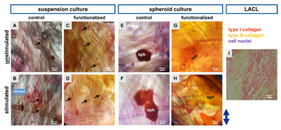 Representative pictures presenting an overview of the colonized scaffolds stained by Sirius Red. Control scaffolds seeded with cell suspension (dynamically pre-cultured for 24 h) either unstimulated (A) or stimulated (B) and functionalized scaffolds either unstimulated (C) or stimulated (D). Spheroid (sph) pre-colonized control scaffolds (statical pre-culture for 5 days) either unstimulated (E) or stimulated (F) and functionalized scaffolds either unstimulated (G) or stimulated (H). The double headed blue arrow (right side) indicated the stretch direction. The native lapine anterior cruciate ligament (LACL) is shown to see the thicker and mature type I collagen fibers (red-orange), the thinner type III collagen fibers (yellow) and the cell nuclei (violet) (I). Scale bars: 200 µm. The samples of one experiment were stained. Black arrows: pericellular type I collagen staining depicted in red.