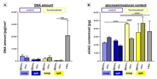 DNA amount and sulphated glycosaminoglycan (sGAG) content of colonized scaffolds in comparison to the native lapine anterior cruciate ligament (LACL). The DNA amount per cubic centimeter (A) and the sGAG content per cell (B) were evaluated in control scaffolds (blue) and functionalized scaffolds (yellow) with two different colonization strategies (suspension = susp: 24 h dynamically pre-cultured and spheroid = sph, 5 days statically pre-cultured). Additionally, the effect of stretch (striped bars) was evaluated. DNA amount and sGAG content of the native lapine ACL [LACL] were shown (grey). Three independent experiments with cells of three different donors were performed. One-way ANOVA test with Tukey post hoc test showed significant differences (***) with p ≤ 0.0005 and (****) with p ≤ 0.0001.