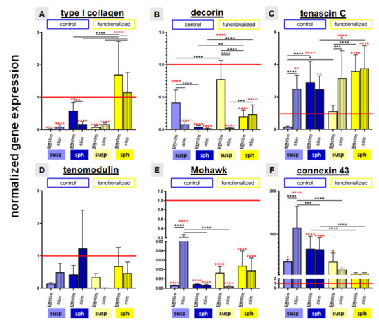 It was also significantly higher in the absence of stretching in cells on the suspension pre-cultured control and functionalized scaffolds in comparison to those on the same scaffolds seeded with the spheroid pre-culturing method. The mechanostimulation induced a significant reduction of the relative gene expression of decorin in cells on control and functionalized scaffolds pre-cultured with cell suspension but not in functionalized scaffolds seeded with spheroids. Cells on functionalized scaffolds seeded with spheroids, irrespectively whether stimulated or not, exerted a significantly higher decorin gene expression compared to the control scaffolds (Figure 8B).