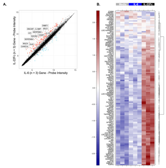 Gene upregulation induced by IL-22 and not IL-6. (A) Scatterplot comparing the microarray gene expression from HT-29 cells cultured for 24 h with either UTTR1174A (IL-22Fc) or IL-6 prior to the RNA isolation. The colored points indicate genes with significant differential expression (2.0-fold change, adjusted p < 0.05). The labeled points indicate 13 genes with a fivefold change (adjusted p < 0.05). (B) Heat map from the same experiment using stricter specificity criteria, defined as the union of genes that were at least 1.5-fold upregulated by UTTR1147A, less than 1.2-fold upregulated by IL-6, and had at least a 1.5-fold difference between UTTR1147A and IL-6. Three biological replicates are represented.