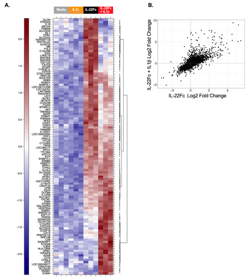 Differential gene expression by IL-22 in the presence of IL-1β. (A) Heat map with the microarray gene expression from HT-29 cells cultured for 24 h with or without IL-1β, IL-22Fc or IL-22Fc + IL-1β prior to the RNA isolation. Three biological replicates are represented. (B) Scatterplot showing the genes upregulated by IL-22 alone vs. IL-22 + IL-1β.