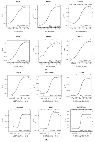 In order to generate a specific gene signature, we evaluated the expression of genes following UTR1147A stimulation and filtered out genes that were also highly upregulated by IL-6 (i.e., STAT3-dependent but not IL-22 specific). This approach was selected to deconvolute the contribution of IL-22 as a therapeutic from those of general inflammation signals mediated through pSTAT3. We were able to identify genes enriched for IL-22 response compared to IL-6, albeit not completely exclusive to IL-22, given the close overlap in the genes induced given the cytokines’ shared STAT3 signaling pathway (Figure 2A). The upregulation of IL1R1 by IL-22 in the HT-29 cells was identified in the initial experiments and further explored for its potential to alter the gene expression patterns in the target cells. Previously, HT-29 cells were shown to produce significantly increased levels of CXCL8 protein in the presence of IL-22 and TNF-α or IL-1β compared to those with TNF-α or IL-1β alone [38], where the authors suggest that the angiogenesis-enhancing capacity of CXCL8 may contribute to the role of IL-22 in wound-healing responses. In the current study, the combination of IL-22 and IL-1β generated an altered gene expression pattern compared to IL-22 in the absence of IL-1β (Figure 3). DMBT1 was identified as a characteristic IL-22-responsive gene in a prior study, and here it was not differentially expressed in the presence or absence of IL-1β, confirming the previous mouse and in vitro human studies [23,39]. However, the pattern observed in the presence of IL-1β was most similar to the ex vivo signatures identified in mice [15], and included the upregulation of anti-microbial peptides such as REG3A and SAA, a hallmark of IL-22 function. The differentiation of Th17 cells via IL-23 or IL-6 is dependent on the presence of IL-1β [40], and IL-1β is also involved in the differentiation of innate T cells and ILCs to IL-22-producing subsets [2]. Therefore, IL-1β is likely to be present in the inflammatory milieu where these cells develop, and may modulate the gene expression response to IL-22 when present. This may suggest that the differential pattern of expression in the presence of IL-1β is relevant in primary epithelium, and that a successful PD biomarker gene signature in the gut should take genes upregulated by IL-22 in the presence or absence of IL-1β into account. Several genes identified from the IL-22 signature, either in the presence or absence of IL-1β, demonstrated high sensitivity to UTTR1147A at low doses and were dose-responsive across a broad range of doses, suggesting that the signature may be useful as a clinically translatable PD biomarker (Figure 4).