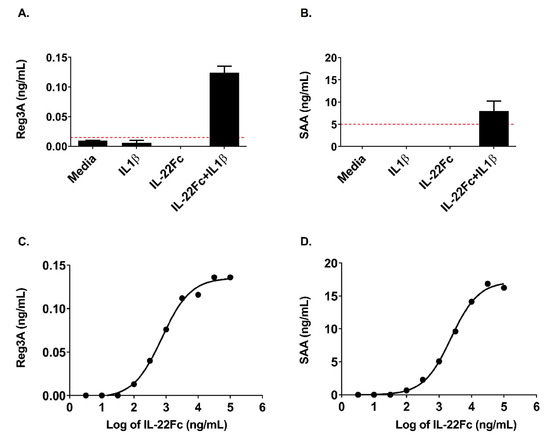 In order to understand whether the IL-22 gene expression data translated to changes at the protein level, we assessed the secretion of REG3A and SAA proteins (used as secreted PD biomarkers in preclinical studies) by HT-29 cells following IL-22Fc stimulation in the presence or absence of IL-1β (Figure 5). REG3A and SAA proteins were produced only when UTTR1147A was used in combination with IL-1β, as is consistent with IL-22 alone and the IL-22+IL-1β gene signatures (Figure 5A,B). Additionally, the increases in the secreted proteins were dose dependent, similar to the gene expression, and sensitive, with REG3A and SAA being produced at doses as low as 100 ng/mL of UTTR1147A, but only in the presence of IL-1β (Figure 5C,D).
