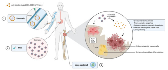 The use of nanocarrier-based drug delivery systems for the treatment of bone cancer. Nanocarriers loaded with chemotherapeutic agents may be administered either systemically (1), orally (2) or through a minimally invasive loco-regional approach (3). Once at the cancer site, nanocarriers are able to release the drug under different stimuli from the microenvironment and to selectively target cancer cells. On the other hand, biomaterials constituting the systems are able to increase MSC differentiation toward osteoblasts by upregulating the expression of target genes. DOX = doxorubicin; CDDP = cisplatin; MTX = methotrexate; ALP = alkaline phosphatase; OPN = osteopontin; OCN = osteocalcin. Created with BioRender.com on 18 May 2021.