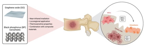 Currently, an innovative bone cancer therapeutic approach is based on photothermal treatment (PTT) as a minimally invasive procedure that can apply selective cytotoxicity on cancer cells, thus reducing detrimental effects toward healthy tissues. Moreover, many studies reported the effects of PTT on bone regeneration by enhancing cell proliferation (i.e., human mesenchymal stem cells, hMSCs) and inducing osteogenic differentiation [94,95]. To enhance PTT effects on bone cancer and bone regeneration, some transducing agents have been developed. Here, therapeutic biomaterials such as exfoliated black phosphorus, graphene oxide (GO), and carbon dots (CDs) for osteosarcoma treatment, are reported.