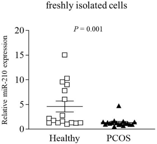 Relative expression of miR-210 in freshly isolated GLCs from PCOS and healthy normally ovulating women. miR-210 levels were measured in freshly isolated GLCs from PCOS and healthy control women by qPCR. Results are presented as a scatter plot with mean values ± SEM (n = 16 per group); squares denote values obtained in healthy controls, triangles denote values obtained in the PCOS group. The p-value indicates the statistically significant difference between groups.