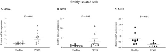 Relative expression of GPD1L, SDHD, and EDN2 in freshly isolated GLCs from PCOS and healthy, normally ovulating women. (A) GPD1L, (B) SDHD, and (C) EDN2 mRNA levels were measured in freshly isolated GLCs from PCOS and healthy control women by qPCR. Results are presented as scatter plots with mean values ± SEM (n = 9 per group); squares denote values obtained in healthy controls, triangles denote values obtained in the PCOS group. The p-values indicate statistically significant differences between groups.