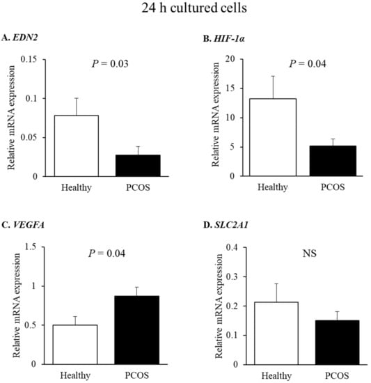 Relative expression of HIF-1α and selected HIF-1α-responsive genes in cultured GLCs derived from PCOS and healthy, normally ovulating women. GLCs derived from PCOS and healthy control women (n = 6 in both groups) were incubated with culture medium for 24 h. Then, RNA was extracted, and (A) EDN2, (B) HIF-1α, (C) VEGFA, and (D) SLC2A1 levels were determined by qPCR. The results are presented as the means ± SEM. The p-values indicate statistically significant differences between groups. NS: non-significant.