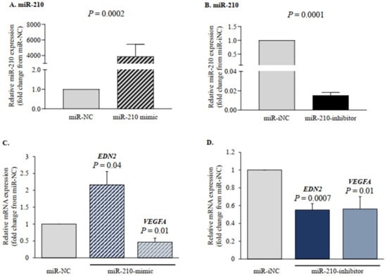 miR-210 manipulation affects the expression of HIF-1α-responsive genes—EDN2 and VEGFA—in human GLCs. (A,C) Human GLCs were transfected with 10 nmol/L of either miR-210-mimic or miR-negative control (miR-NC). (B,D) Human GLCs were transfected with 60 nmol/L of either miR-210-inhibitor or miR-inhibitor negative control (miR-iNC). RNA was extracted at 48 h after transfection, and miR-210 (A,B), EDN2, and VEGFA (C,D) levels were determined by qPCR. The results are presented as the means ± SEM from three independent experiments. The p-values indicate statistically significant differences from respective NCs, designated as 1.