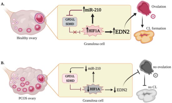 Proposed role of hypoxia-related factors in PCOS ovulatory defects, compared with normally ovulating women. (A) In healthy human GLCs, HIF-1α transcriptionally upregulates miR-210 levels which, in turn, downregulates its target genes (GPD1L and SDHD), thereby stabilizing HIF-1α. This feed-forward loop between miR-210, the miR-210 target genes, and HIF-1α enhances EDN2 in GCs during ovulation and CL formation. (B) However, in the GLCs of PCOS women, the suppressed expression of HIF-1α leads to reduced miR-210 levels. Lower miR-210 elevates GPD1L and SDHD, which destabilize HIF-1α and reduce EDN2. Low levels of EDN2 may cause ovulatory defects in women with PCOS. The figure was created with BioRender.com.