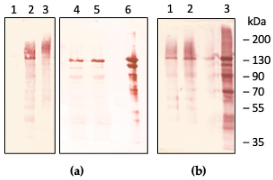 A first anion exchange chromatography of culture supernatants on DEAE-Sepharose yielded a fraction eluted at 150 mM NaCl that was enriched in CP (Figure 2a). This fraction was further purified on AE-Sepharose, a chloroethylamine-derivatized Sepharose matrix with high affinity for CP [33,34]. At variance with the hyperglycosylated recombinant protein produced in our previous work [20,25], CP bound strongly to AE-Sepharose and it was eluted at 500 mM NaCl. SDS-PAGE analysis demonstrated that the protein had a high degree of purity, and no degradation was apparent. The recombinant CP exhibited a slightly higher Mr compared to the plasma-derived protein (Figure 2b, lane 4 vs. lane 5). The yield of pure recombinant human CP was about 0.1 mg from 1 L culture.