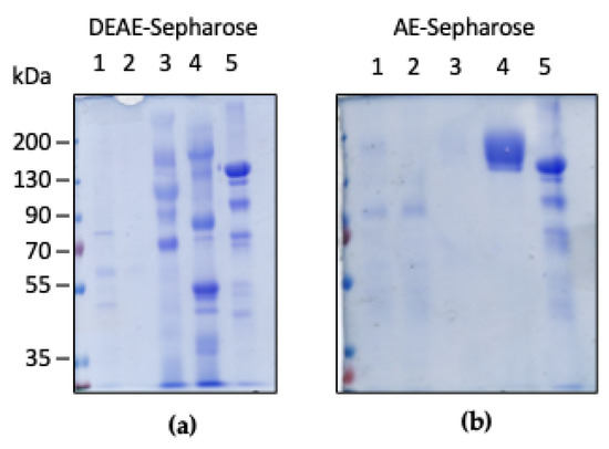 SDS-PAGE analysis of recombinant CP purified on DEAE-Sepharose (a) and AE-Sepharose (b). Panel (a): lane 1, input; lane 2, unbound fraction; lane 3, fraction eluted with NaCl 150 mM; lane 4, fraction eluted with NaCl 250 mM; lane 5, plasma-derived CP (5 μg). Panel (b): lane 1, input; lane 2, unbound fraction; lane 3, fraction eluted with NaCl 250 mM; lane 4, fraction eluted with NaCl 500 mM (8 μg); lane 5, plasma-derived CP (5 μg).