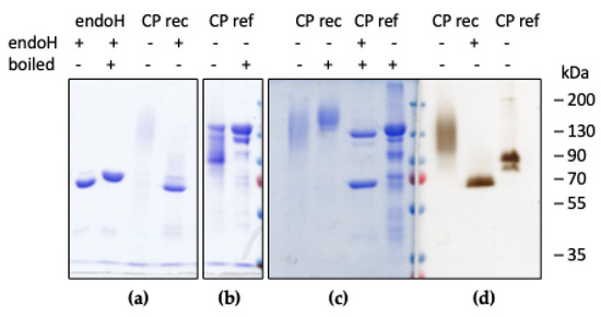 SDS-PAGE analysis of purified recombinant CP before and after treatment with endoH. Recombinant CP was incubated with EndoH in non-denaturing conditions. Samples of recombinant CP (CP rec, 1 μg in panel (a), 3 μg in panels (b–d)) and of plasma-derived CP (CP ref, 5 μg) were loaded with or without heat treatment as indicated. EndoH is shown in the first two lanes. Panels (a–c): Coomassie staining; panel (d): oxidase activity staining with oDA.