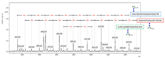 MALDI TOF spectrum of recombinant CP tryptic glycopeptides including their peptide backbones and glycans attached.