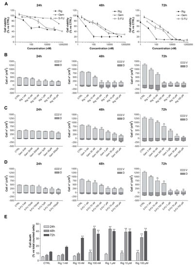 Trypan blue vital count of EGI-1 cells treated with Rig, Gem, or 5-FU. (A) Percentage of viable cells after treatment with different concentrations of Rig (1 nM–100 µM), Gem (3 nM–300 µM), and 5-FU (7 nM–700 µM). (B) Number of viable (V) and dead (D) cells treated with increasing concentrations of Rig (1 nM–100 µM) for 24, 48, and 72 h. (C) Number of viable (V) and dead (D) cells treated with increasing concentrations of Gem (3 nM–300 µM) for 24, 48, and 72 h. (D) Number of viable (V) and dead (D) cells treated with increasing concentrations of 5-FU (7 nM–700 µM) for 24, 48, and 72 h. (E) Percentage of counted EGI-1 death cells after Rig treatment. The percentage is calculated on the total number of counted cells. Data are presented as the mean ± SD of at least three independent experiments (* p < 0.05, ** p < 0.01 vs. CTRL).