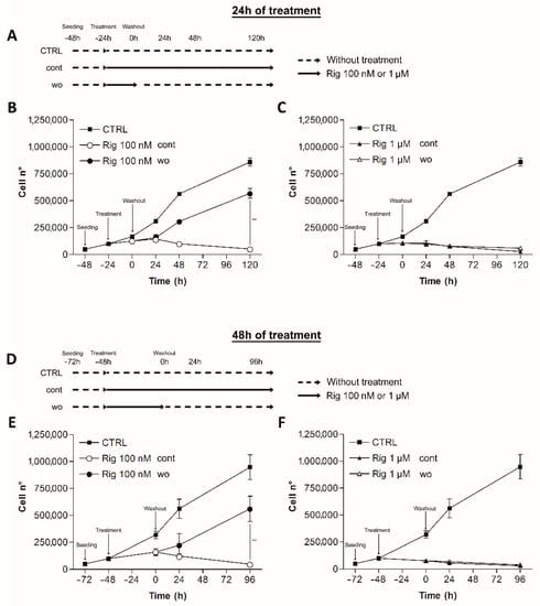 Reversibility of Rig against cell viability of EGI-1 cells. (A–D) Time schedules of Rig treatments. Black arrows represent the presence of Rig (100 nM or 1 µM) in the culture medium of continuous (cont) or washout (wo) treatments. Dashed lines represent culture medium without treatment (CTRL). (B,C) EGI-1 cells were treated with Rig 100 nM (B) or 1 µM (C). After 24 h of Rig treatment, the medium was changed with fresh medium with or without Rig (cont or wo) (E,F) EGI-1 cells were treated with Rig 100 nM (E) or 1 µM (F). After 48 h of Rig treatment, the medium was changed with fresh medium with or without Rig (cont or wo). Both after 24 or 48 h of Rig treatment the number of viable cells were counted using trypan blue 24, 48, 120 h after the medium change. EG-1 cells continuously treated with Rig (cont) and EG-1 cells without any type of treatment (CTRL) represent, respectively, positive and negative controls. Data are represented as the mean ± SD of at least three independent experiments (** p < 0.01 Rig cont vs. Rig wo).