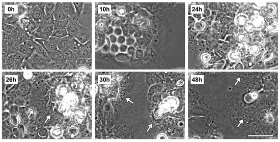 Preliminar live imaging studies were performed to evaluate the morphological alteration of EGI-1 cells following Rig 100 nM treatment (the concentration able to a maximum effect on cell viability). The representative images of Figure 3 show the most important events observed during the experiment. At start time (0 h), EGI-1 cells had a normal epithelioid shape and were mononucleated. After 10 h of Rig treatment cells became 3D-round-shaped (indicative of attempted mitosis), and this alteration persisted until 24 h of treatment. At 26 h, the first micronucleated cells appeared, and round-shaped cells were reattached to the dish surface. At 30 h, cells expanded their size, and increased the number of micronucleated cells was evident. These aspects also persisted at 48 h.