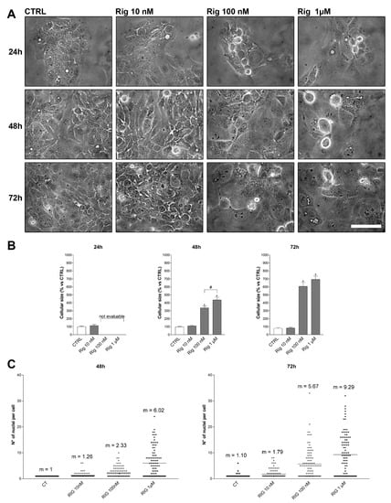Based on these results, we have performed morphology experiments treating EGI-1 cells with different concentrations of Rig (10 nM, 100 nM, and 1 µM) for 24, 48, and 72 h. Cells size was measured, and the number of nuclei was counted.