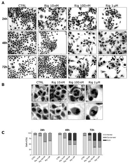 Nuclei morphology and micronucleation were evaluated by GIEMSA staining of EGI-1 cells. Cells were treated with different concentrations of Rig (10 nM, 100 nM, and 1 µM). After 24, 48, and 72 h, cells were stained with GIEMSA dye. At Rig 10 nM, condensed chromosomes and micronuclei were observed, respectively, only after 48 and 72 h of treatment. Differently, in the presence of Rig 100 nM and 1 µM, condensed chromosomes were evident after 24 h of treatment. Instead, micronucleated cells became visible after 48 h of Rig (Figure 5). Comparing 48 and 72 h of treatment, both for Rig 100 nM and 1 µM, the percentage of EGI-1 cells with normal nuclei decreased, while those with condensed nuclei increased. The percentage of cells with micronuclei remained constant.