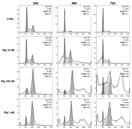 To analyze cell cycle modifications, EGI-1 cells were treated with Rig (10 nM, 100 nM, and 1 µM), and after 24, 48, and 72 h, cells were collected and analyzed by FACS (Figure 6).
