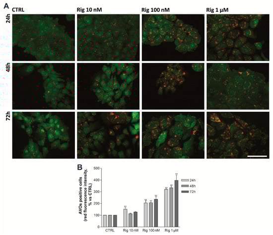 EGI-1 cells autophagy activity after Rig treatment. (A) Representative images of EGI-1 cells untreated (CTRL) or treated with different concentrations of Rig (10 nM, 100 nM, and 1 µM) at different times (24-48-72 h). Cells were stained with AO 1 µg/mL, and images were taken under a fluorescent microscope. Cytosol and nuclei are represented in green, while red represents AVOs. Scale bar 50 µm. (B) The graph represents the percentage of AVOs positive cells described in (A). Data are represented as the mean red fluorescence ± SD of three independent experiments. The red fluorescence intensity of CTRL is arbitrarily set to 100%. (** p < 0.01 vs. CTRL).