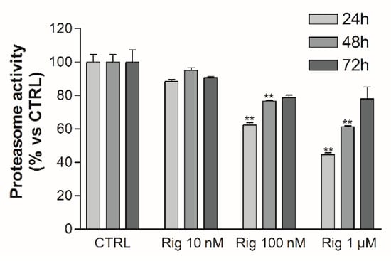 EGI-1 cells proteasome activity after Rig treatment. Proteasome activity of EGI-1 cells untreated (CTRL) or treated with different concentrations of Rig (10 nM, 100 nM, and 1 µM) at different times (24-48-72 h). The graph represents the mean ± SD of proteasome activity normalized to untreated controls set at 100%. (** p < 0.01 vs. CTRL).