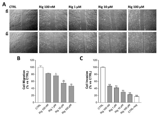 EGI-1 cell migration and invasion. (A) Representative images and (B) respective graph of the scratch wound healing assay of EGI-1 cells treated with increasing concentrations of Rig. The graph represents the mean ± SD percentage of the area of cells that were able to close the scratch after treatment with increasing concentration of Rig compared to corresponding untreated control cells. (C) Boyden chamber assay of EGI-1 cells treated with increasing concentrations of Rig. The graph represents the percentage of cells that can pass through the membrane. CTRL and CTRL-neg represent cells without any treatment that passed through the membrane, respectively, in the presence or absence of serum in the low chamber. Graphs are the mean ± SD of three independent experiments. (* p < 0.05, ** p < 0.01 vs. CTRL).