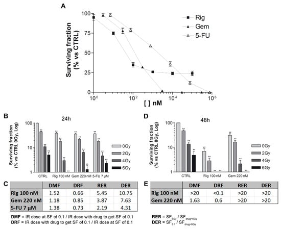 Clonogenic assay of EGI-1 cells and Rig. (A) Clonogenic assay of EGI-1 cells treated with increasing concentrations of Rig (1 nM–100 µM), Gem (3 nM–300 µM), and 5-FU (7 nM–700 µM) without radiations. (B) Clonogenic assay of EGI-1 cells treated with Rig 100 nM, Gem 220 nM, and 5-FU 7 µM for 24 h, and irradiated with increasing doses (0–6 Gy). (C) Results table of clonogenic assay of (B). DMF = Dose Modifying Factor, DRF = Dose Reduction Factor, RER = Radiation Enhancement Ratios and DER = Drug Enhancement Ratios, IR = irradiation, SF = surviving fraction. (D) Clonogenic assay of EGI-1 cells treated with Rig 100 nM and Gem 220 nM for 48 h, and irradiated with increasing doses (0–6 Gy). (E) Results table of clonogenic assay of (D). Graphs represent the mean ± SD surviving fraction of three independent experiments. (** p < 0.01 vs. CTRL).