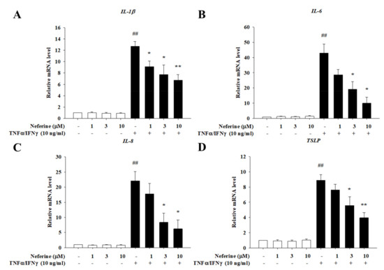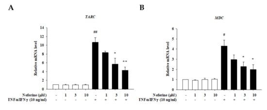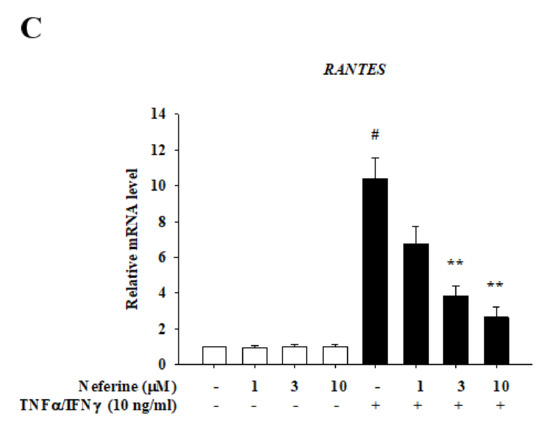 2.2. Neferine Reduced the mRNA Expression of Pro-Inflammatory Cytokines and Chemokines in TNF-α/IFN-γ-Stimulated HaCaT Cells