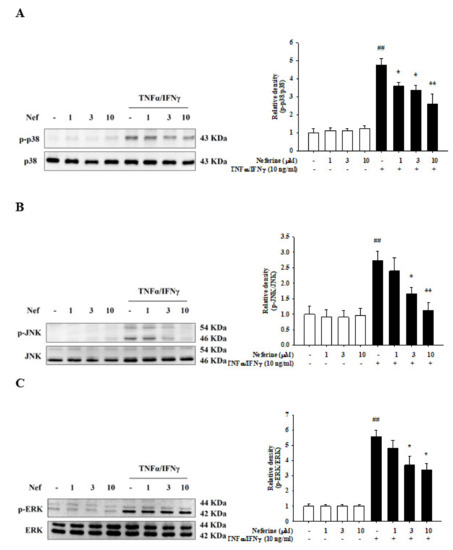 2.3. Neferine Reduced MAPK Activation in TNF-α/IFN-γ-Stimulated HaCaT Cells