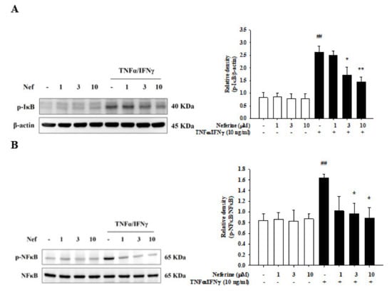 2.4. Neferine Reduced IκB and NF-κB Activation in TNF-α/IFN-γ-Stimulated HaCaT Cells