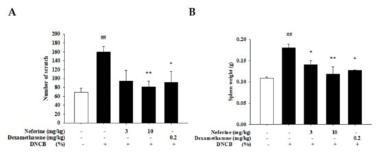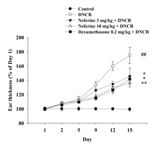 2.5. The Effect of Neferine on the Skin Appearance in DNCB-Induced BALB/c Mice