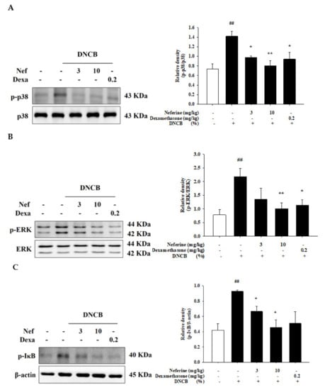 2.7. Neferine Inhibits the Phosphorylation of p38 and ERK Induced by DNCB in BALB/c Mice