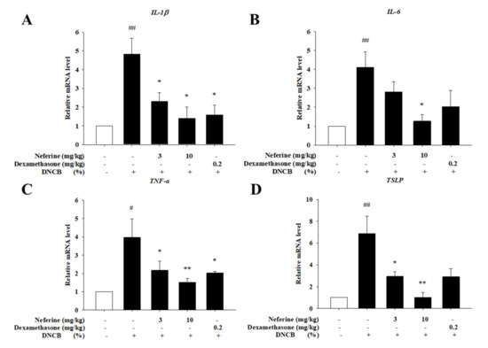2.8. Neferine Downregulates the mRNA Expression of Pro-Inflammatory Cytokines and Chemokines Induced by DNCB