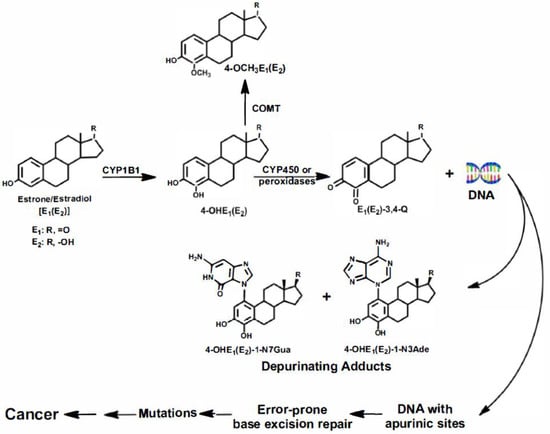 The pathway by which estrogens can cause cancer is shown in Figure 1. In this pathway, the estrogens estrone (E1) and estradiol (E2) are oxidized by cytochrome P450 (CYP)1B1 to the 4-catechol estrogens, 4-OHE1(E2) [], which are further oxidized to the E1(E2)-3,4-quinones [E1(E2)-3,4-Q] by cytochrome P450 or peroxidases. Estrogen metabolism can be balanced or unbalanced in terms of the levels of catechol estrogen quinones formed. Normally, estrogen metabolism is balanced and low levels of E1(E2)-3,4-Q are formed, but when estrogen metabolism becomes unbalanced, higher levels of 4-OHE1(E2) and E1(E2)-3,4-Q are formed [,,,]; this has been demonstrated in the kidneys of Syrian golden hamsters [], prostates of Noble rats [,], mammary glands of estrogen receptor knock-out (ERKO)/Wnt-1 mice [], and breasts of women [].