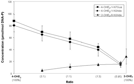 Depurinating adducts formed after 10 h (to allow complete depurination of 4-OHE2-1-N7Gua) by mixtures of lactoperoxidase-activated 4-OHE2 and 2-OHE2 reacted with DNA at different ratios. The level of stable adducts formed in the mixtures was less than 1% of the total adducts [].