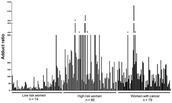 The ratio of depurinating estrogen-DNA adducts to estrogen metabolites and conjugates has been analyzed extensively in women diagnosed with breast cancer compared with women at normal or high risk of developing the disease (Figure 3) [,,]. This ratio has no units because they cancel out between the numerator and denominator. The ratio in women at normal risk of developing breast cancer was significantly lower than the ratio in women at high risk or diagnosed with breast cancer (p < 0.001) in three different studies [,,]. Similar estrogen-DNA adduct ratios are found in postmenopausal women and premenopausal women [], establishing that the balance of estrogen metabolism does not depend on the level of circulating estrogens in a person. Instead, the balance of estrogen metabolism depends on a person’s enzymological makeup and can be affected by environmental factors that alter the balance of enzyme activities.