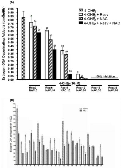 In order to consider resveratrol and/or NAC as potential cancer-preventing compounds, it is necessary to demonstrate their ability to reduce the formation of estrogen-DNA adducts in humans. Therefore, a study was conducted to test the two compounds’ ability to affect adduct formation in normal healthy women. A total of 21 women provided a urine sample before and after a 3-month treatment regimen that included taking resveratrol and NAC daily for 3 months. The urine samples were analyzed for estrogen metabolites, conjugates, and depurinating DNA adducts. In these women, the ratio of estrogen-DNA adducts to estrogen metabolites and conjugates was reduced by a statistically significant amount (p = 0.03, Figure 4B) during the three-month study period []. These results suggest that ingestion of NAC and resveratrol may constitute a safe, low-cost, effective measure to prevent breast cancer and other types of cancer.