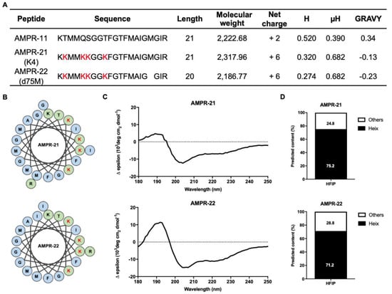 Physical properties and secondary structure analysis of the AMPR-11 analog peptides. (A) The physical properties of the AMPR-11 analog peptides. All items were calculated using the ProtParam tool and ADP3 server. H, hydrophobicity; μH, hydrophobic moment; GRAVY, grand average hydrophobicity and hydrophilicity. (B) Alpha-helical wheel prediction for AMPR-21 and AMPR-22. Illustrations were recreated based on results from the helical wheel projections server. Blue, nonpolar amino acids; green, polar amino acids; red letter, changed sequences from AMPR-11. (C) CD spectroscopy of AMPR-21 and AMPR-22. All of the results were corrected by the buffer-only baseline. (D) The secondary structure compositions of the AMPR-11 analog peptides from the CD spectra. The data were predicted using the BeStSel server.