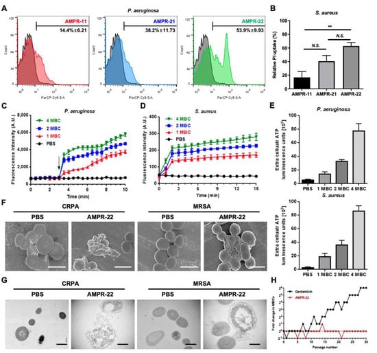 AMPR-11 showed antibacterial activity in various bacterial strains, including MDR strains [22]. AMPR-21 and AMPR-22 were also expected to show antibacterial activity. Therefore, we determined the MBC value of these peptides against the 17 bacterial strains we tested previously [22] by modified MBC determination assay. As expected, both peptides showed a broad spectrum of antibacterial activity (Table 2). Next, we measured cell permeabilization caused by AMPR-11, AMPR-21, and AMPR-22 using a propidium iodide (PI) uptake assay and flow cytometry. AMPR-22 induced more cell permeabilization than AMPR-11 or AMPR-21 in both gram-positive and gram-negative bacterial strains (Figure 2A,B). The outer membrane permeabilization in gram-negative bacteria was also analyzed using a 1-N-phenylnaphthylamine (NPN) uptake assay. NPN is normally not permeabilized by the bacterial membrane and is weakly fluorescent in a buffer solution, but when it is taken up by membrane permeabilization, the fluorescence intensity increases strongly. Therefore, the fluorescence intensity of NPN is detectable only in the periplasm of bacteria [26]. As shown in Figure 2C, AMPR-22 treatment immediately induced NPN uptake in a concentration- and time-dependent manner. Next, we measured AMPR-22-induced membrane depolarization in a species of gram-positive bacteria, S. aureus, using 3,3′-dipropylthiadicarbocyanine iodide, {DiSC3(5)}, a membrane potential-sensitive dye [27]. In this assay, AMPR-22 treatment induced a rapid fluorescence increase in a concentration-dependent manner (Figure 2D), indicating that AMPR-22 depolarized the bacterial membrane potential. The leakage of adenosine triphosphate (ATP), which is the main energy source inside cells, was also examined after AMPR-22 treatment of gram-positive and -negative bacteria. Extracellular ATP levels increased after AMPR-22 treatment in both bacterial strains (Figure 2E). Those results demonstrate that AMPR-22 treatment triggers disruption of both the outer and inner bacterial membranes. This bacterial disruption was directly observed in CRPA and MRSA using electron microscopy. In a scanning electron microscope (SEM), the membranes of the MDR bacterial strains showed obvious morphological changes. The membrane surface of bacteria treated with AMPR-22 was severely wrinkled and shrunk (Figure 2F). Morphological changes were also observed using transmission electron microscopy (TEM). In that experiment, the bacterial membrane was damaged and disrupted by AMPR-22 treatment (Figure 2G). In addition to those experiments, we performed a serial passage assay to determine whether AMPR-22 would enable the acquisition of drug resistance. As shown in Figure 2H, P. aeruginosa showed high sensitivity to AMPR-22 for 30 passages. In contrast, resistance to gentamicin developed after nine passages. The modified MBC value of bacteria treated with gentamicin increased 64-fold after 30 passages (Figure 2H).