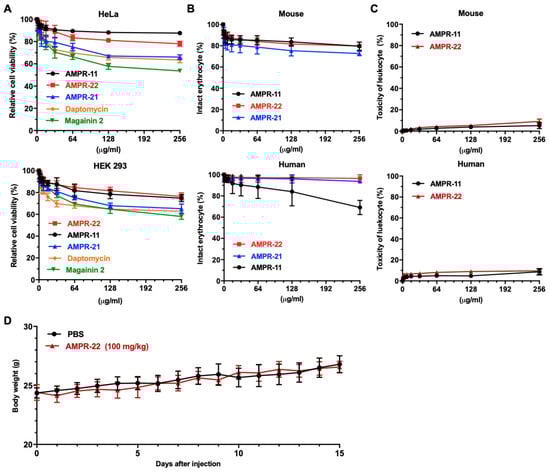 The cytotoxicity of AMPR-22. (A) The cell toxicity of the AMPR-11 analog peptides was measured using the MTT assay in HeLa and HEK293 cells. Daptomycin and magainin 2 were also tested. (B) A hemolysis assay was performed in mouse and human blood. The percentage of hemolyzed erythrocytes was measured using a spectrophotometer. Peptides were serially diluted and incubated with cells for an hour. (C) The toxicity of leukocytes was measured using a flow cytometric assay with LIVE/DEAD fixable dead cell™ stain dye and freshly isolated mouse and human PBMCs. (D) Changes in the body weight of BALB/c mice were observed for 15 days after a single intravenous administration of AMPR-22 or PBS (100 mg/kg, 10-fold higher than working concentration in survival experiments). Data represent the means ± SD of more than three independent experiments.