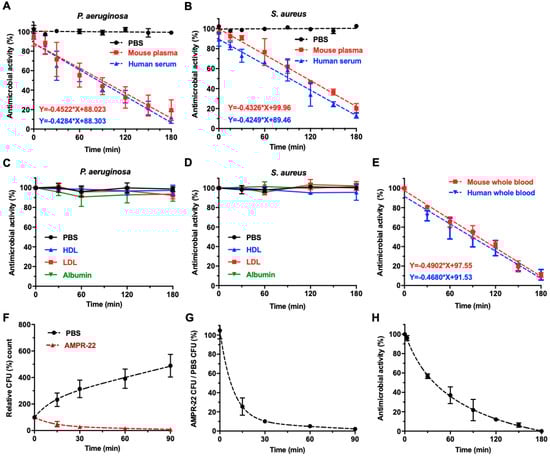 The antibacterial activity of AMPR-22 in various physiological conditions. (A,B) Effects of AMPR-22 activity in mouse plasma and human serum. AMPR-22 was incubated with blood components for the indicated times (0, 15, 30, 60, 90, 120, 150, and 180 min) and then with P. aeruginosa or S. aureus for an hour. (C,D) Effects of AMPR-22 activity in low-density lipoprotein (LDL), high-density lipoprotein (HDL), and bovine serum albumin. AMPR-22 was incubated with blood components for the indicated times (0, 30, 60, 120, and 180 min) and then with P. aeruginosa or S. aureus for an hour. (E) Effects of AMPR-22 activity in whole blood. AMPR-22 was incubated with mouse and human whole blood for the indicated times (0, 30, 60, 90, 120, and 180 min) and then with P. aeruginosa for an hour. (F,G) The antibacterial activity of AMPR-22 in vivo. AMPR-22 was intravenously administered into P. aeruginosa-infected mice, and blood was collected from the tail veins of the mice at the indicated times (0, 15, 30, 60, and 90 min). (F) The relative CFU in blood samples was calculated using the following formula: CFU at indicated time ÷ CFU at 0 min × 100 (%). (G) The relative CFU of blood samples obtained from F was re-graphed using the following formula: CFU of AMPR-22-treated mouse group ÷ CFU of control (PBS) group × 100 (%). (H) The functional half-life measurement of AMPR-22. AMPR-22 was intravenously administered into mice, and blood was collected at the indicated times (0, 5, 30, 60, 90, 120, 150, and 180 min). The blood was collected by cardiac puncture, and the plasma was isolated by centrifugation. Then, the plasma was incubated with P. aeruginosa for an hour. The antibacterial activity was measured using a colony-forming unit assay. Data represent the means ± SD of more than three independent experiments.