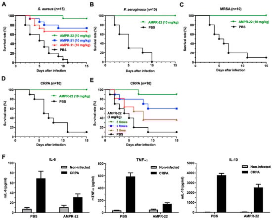 Mice were infected with CRPA as for the murine model study, and then AMPR-22 or PBS was administered an hour after infection. The whole blood of the mice was collected by cardiac puncture 18 h after the bacteria injection, and the plasma was isolated by centrifugation for 15 min at 2000× g. The levels of IL-6, TNF-α, and IL-10 were measured using a mouse ELISA kit (Thermo Fisher Scientific, Waltham, MS, USA) and following the manual supplied by the manufacturer. The effects of AMPR-22 were compared with PBS-treated CRPA-infected mice and non-infected mice.