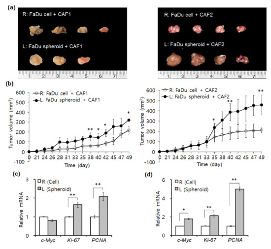 We evaluated tumor formation upon injection of FaDu monolayer cells or 3D spheroids in the oral mucosa of the right or left cheek of mice, respectively. Two populations of primary CAFs (CAF1, CAF2) isolated from different HNSCC tumor tissues were co-injected with FaDu monolayer cells or spheroids into mice. The size of tumors formed during the same period by FaDu spheroids (Figure 2a,b, left cheek) showed a significant increase of size as compared to FaDu cells (Figure 2a,b, right cheek) in both CAFs. Only FaDu spheroid-derived tumors showed a remarkable difference in tumor size according to different CAF group cells (Figure 2b, left cheek). When we analyzed the mRNA expression of some cell proliferation-related genes (c-Myc, Ki-76, and PCNA) in mice tumors with CAF1 (Figure 2c) or CAF2 cells (Figure 2d), these genes showed significantly higher mRNA expression in tumors formed with FaDu spheroids.