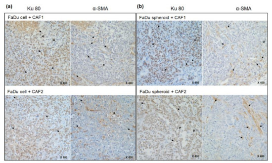 Immunohistochemical analysis of mice xenograft tumors tissues derived from FaDu cells (a) or spheroids (b) with primary CAFs. Tissues were immunostained with anti-Ku80 and α-SMA antibody. Ku80 biomarkers are broadly stained in tumor tissues, such as epithelial cells and fibroblasts (black arrows). Fibroblast-specific α-SMA staining was also detected inside the epithelial tumor cells (black arrows).