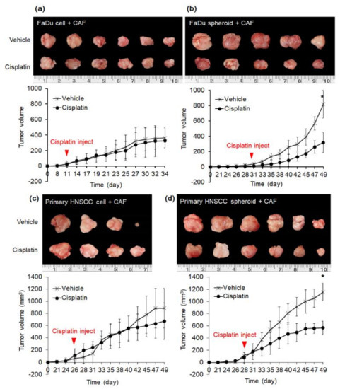 We further compared the effect of cisplatin in mice xenograft derived from spheroids or dissociated cells. We conducted this experiment on FaDu cells and primary HNSCC cells cultured from patients. As shown in Figure 5a, mice tumors derived from FaDu cell and CAF2 showed moderate proliferation when they were observed after 10 days of transplantation. On the contrary, when FaDu spheroid was transplanted with CAF, the tumor was detected after 30 days, but after that, tumor volume increased rapidly (Figure 5b). Mice tumors derived from primary HNSCC cells or spheroids with CAF2 were observed around the same time after 25–27 days of transplantation (Figure 5c,d). Mice were injected with cisplatin or vehicle control for 18–23 days according to the bodyweight or body condition. The tumor growth curves of each group demonstrate that tumors derived from spheroid significantly decreased in volume upon cisplatin treatment in both tumor models. In contrast, there was no significant effect of cisplatin treatment in tumors derived from monolayer cancer cells.