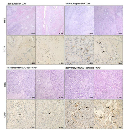 To evaluate in vivo tumor models for chemotherapeutic screening under standardized conditions, mouse tumors formed from cells grown as 2D monolayers or 3D spheroids with primary CAFs were characterized. We compared tumorigenicity and blood vessel formation in mice xenograft. Our study revealed that co-injection of patients’ CAFs with 3D spheroids caused not only vigorous tumor formation but also substantial blood vessel formation inside the tumor, with little necrosis, in contrast to the 2D monolayer cells. A previous study showed that intraperitoneal administration of fibroblasts in nude mice facilitates their extensive recruitment into the stromal region of remote subcutaneous tumors derived from human carcinoma cells [28]. In our results, human-specific Ku80 staining in mice tumor tissues formed by cancer cells and patient-derived CAF co-injection shows relatively even distribution in fibroblasts as well as in cancer cells. Therefore, it is reasonable to assume that CAFs are distributed in the tumor mi-croenvironment when co-injected with FaDu, thus contributing to mice xenograft formation. Additionally, fibroblasts are a key player in tumor microenvironment-mediated drug resistance [29,30]. Therefore, the use of 3D spheroids co-injected with patient-derived CAFs to establish a mouse model for drug screening may help to determine a more optimal, personalized chemotherapy regimen.
